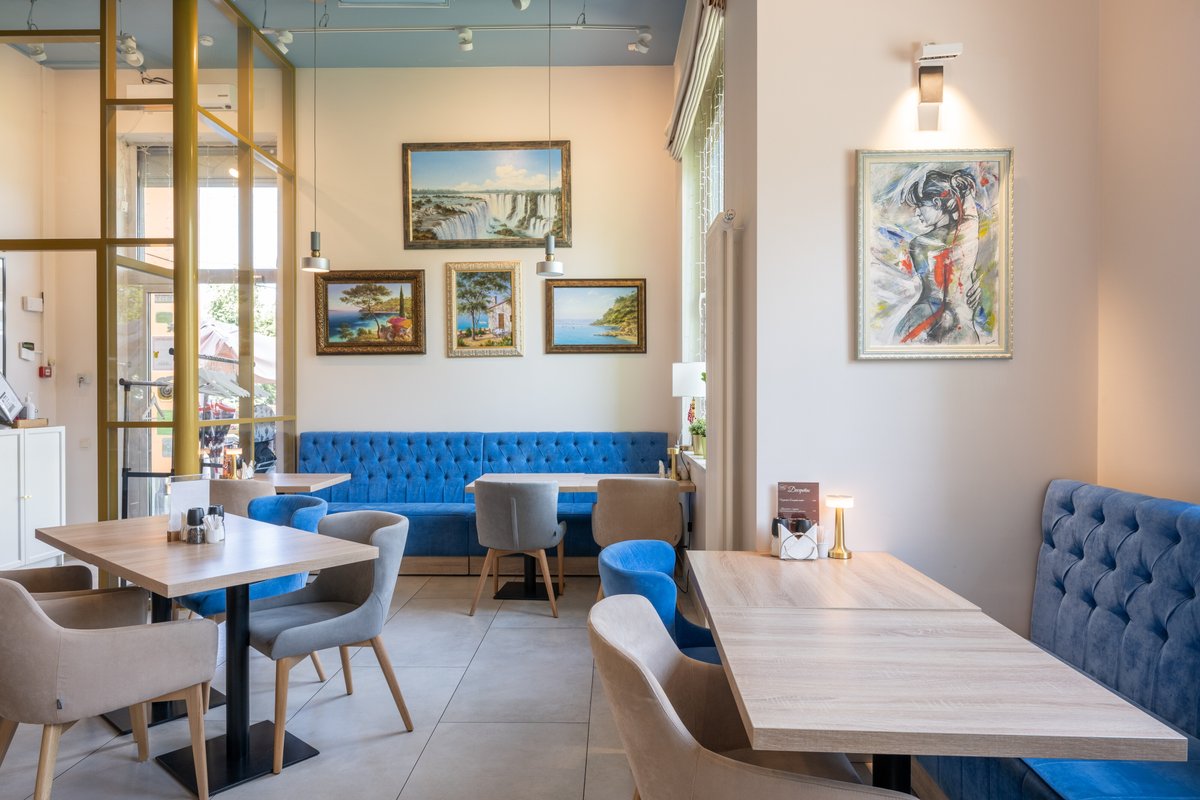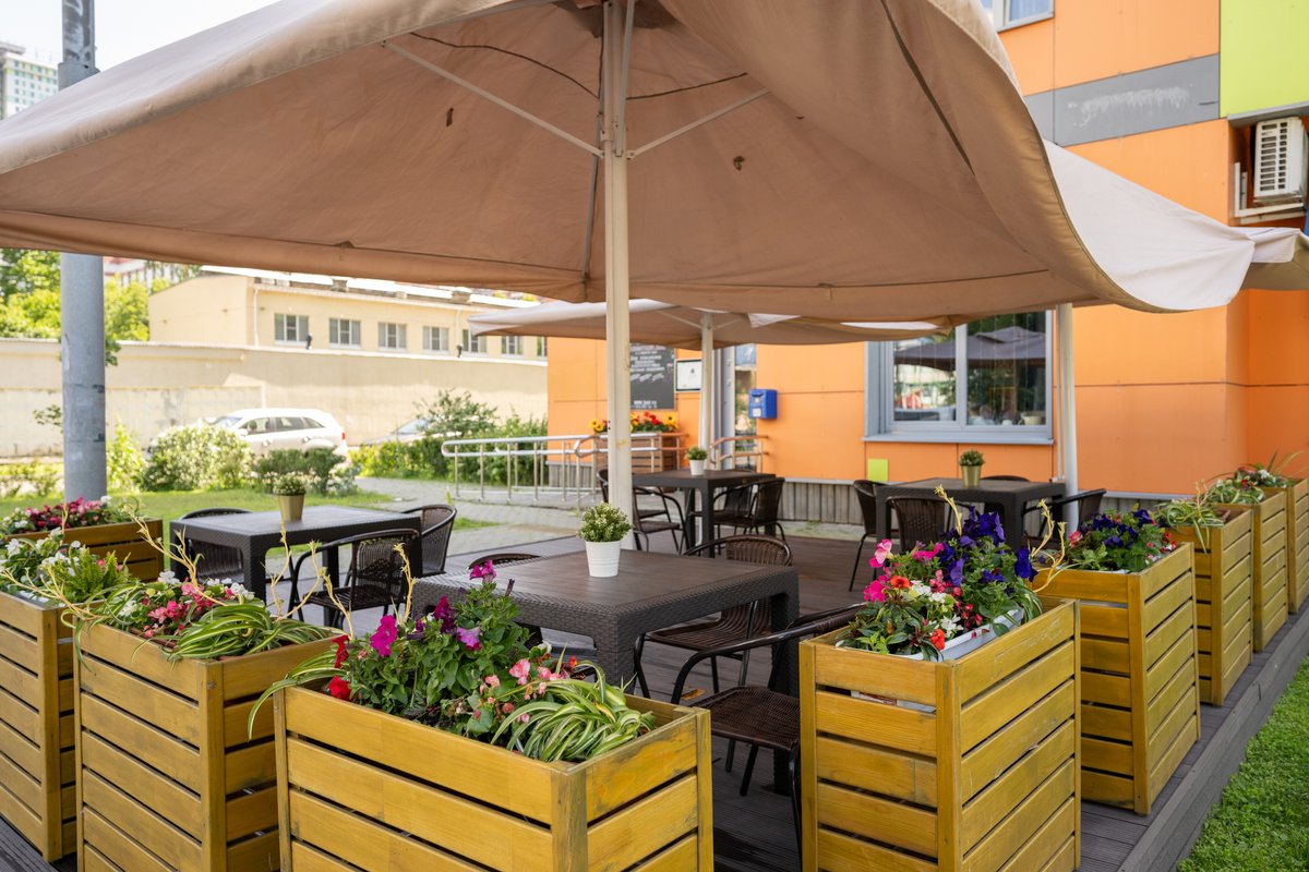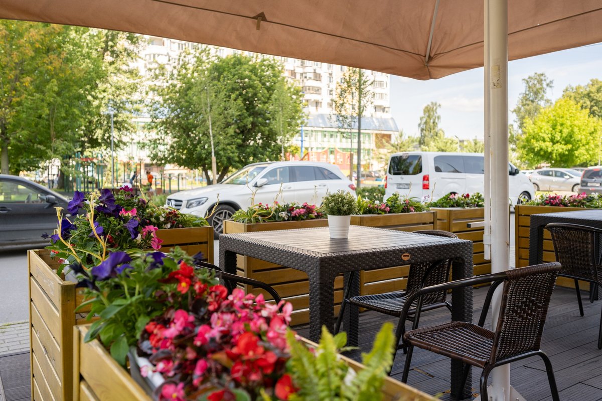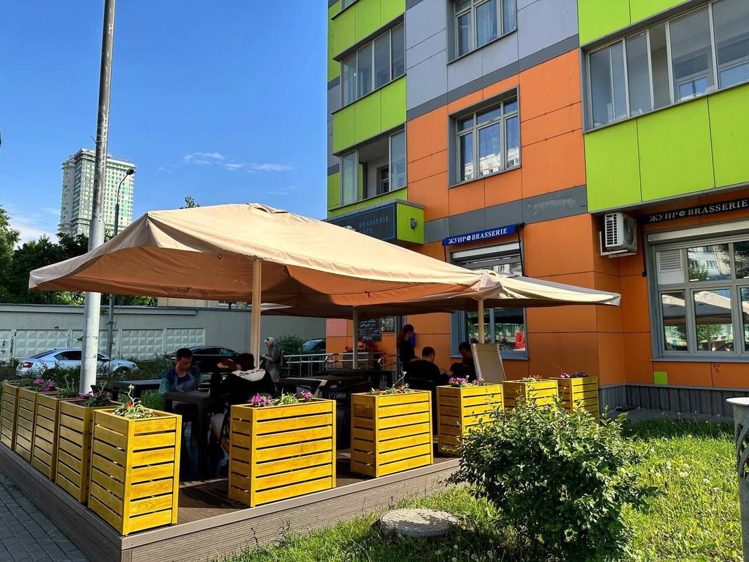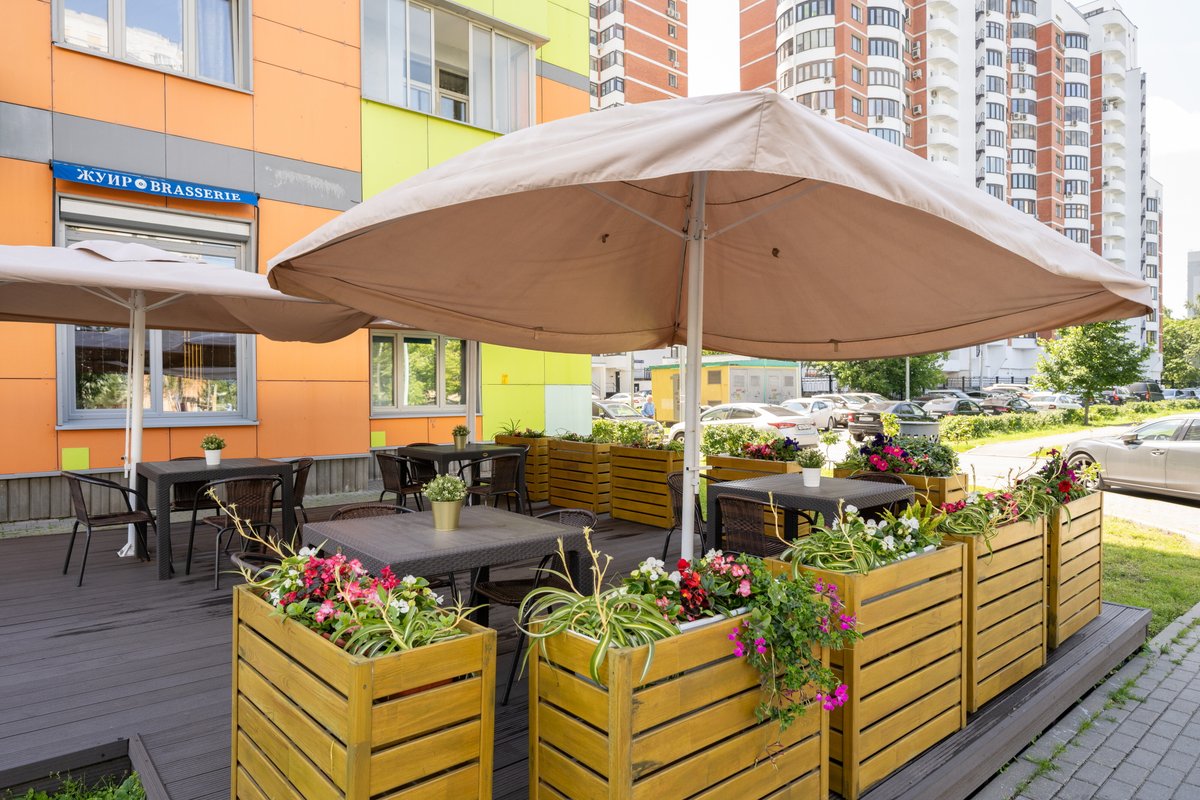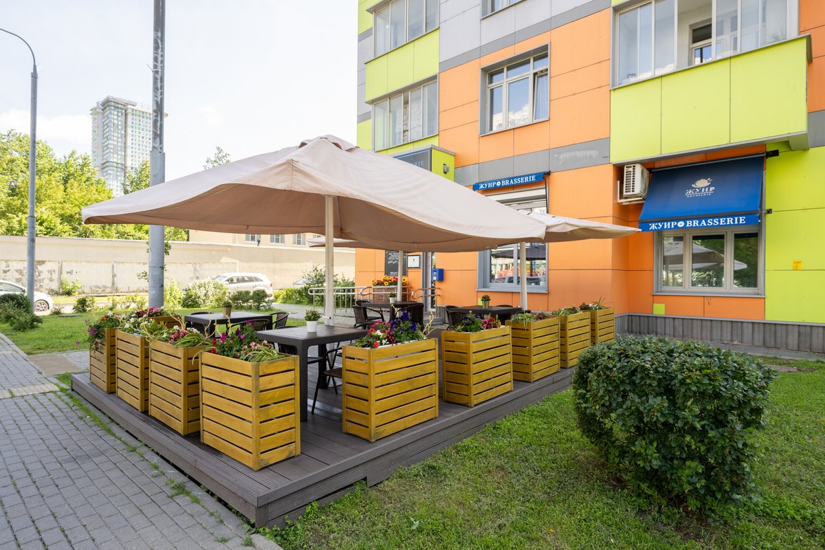В тёплое время года хочется больше бывать в открытом пространстве. И не только чтобы погулять, но и пообедать или поужинать. Именно поэтому у кафе Жуир brasserie есть своя веранда с выходом на улицу.